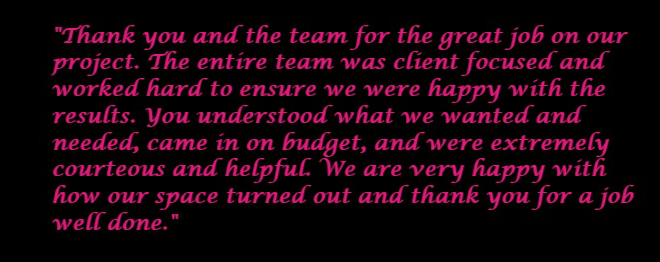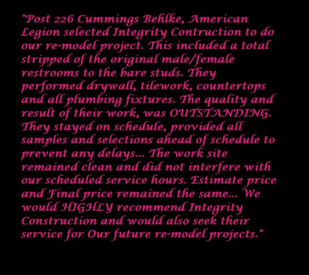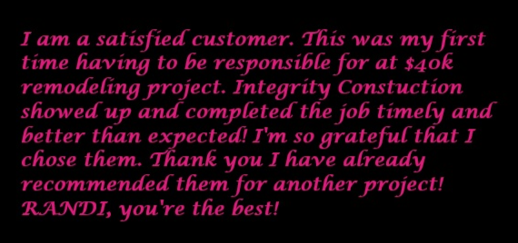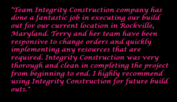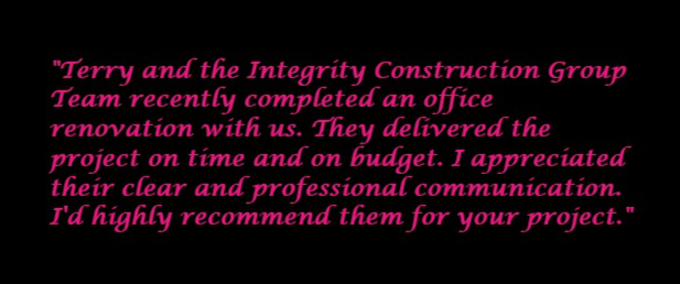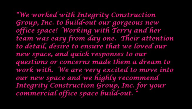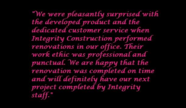 "I recently had Integrity Construction perform my office renovation. Throughout the entire process the work was completed in a timely and professional manner. The scheduled completion date was met, which in my experience is unusual for this industry. As a result, I am extremely pleased with the results and the manner in which the renovation was handled. The company is to be commended."