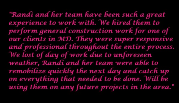 "We recently had the pleasure of working with Integrity Construction for the renovation of our restaurant, Seasalt in Annapolis, MD, and we couldnt be more thrilled with the results. From the outset, their team demonstrated exceptional professionalism, creativity, and dedication to bringing our vision to life, and from the initial reactions of all of our patrons , Integrity truly knocked it out of the park. Throughout the project, we encountered several unforeseen challenges, but Integrity Construction tackled each one head on, consistently overdelivering and ensuring that every detail was meticulously addressed. Their commitment to excellence and their ability to adapt and find innovative solutions truly set them apart. The final outcome is nothing short of spectactular- a one of a kind space that perfectly encapsulates the ambiance we envisioned for SeaSalt. We are immensely grateful to Terry and her team for their hard work, transparency, and unwavering dedication. |We wholeheartedly recommend Integrity Construction Group to anyone seeking top-notch services. We invite you all to come in and check out their amazing transformation that came to life for us and the community. So many thanks to Terry and her amazing team... especially Al who is her lead foreman. That guy is one of the best in the business and you can tell he truly cares about each and every one of his clients".