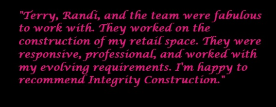 "During the past several years working with Integrity, I continue to partner up with them due to their focus of making my construction process as seamless as possible. Their entire team understands the construction constraints, conditions, and challenges that we face during the course of the implementation and their dedication to resolve the project needs, budget, client requirements, and timeline changes is done effectively. Integrity is always available, communicates effectively, and meets my expectations in quality and project delivery. The entire Integrity team is a pleasure to work with and continues to be a partner for my upcoming projects".